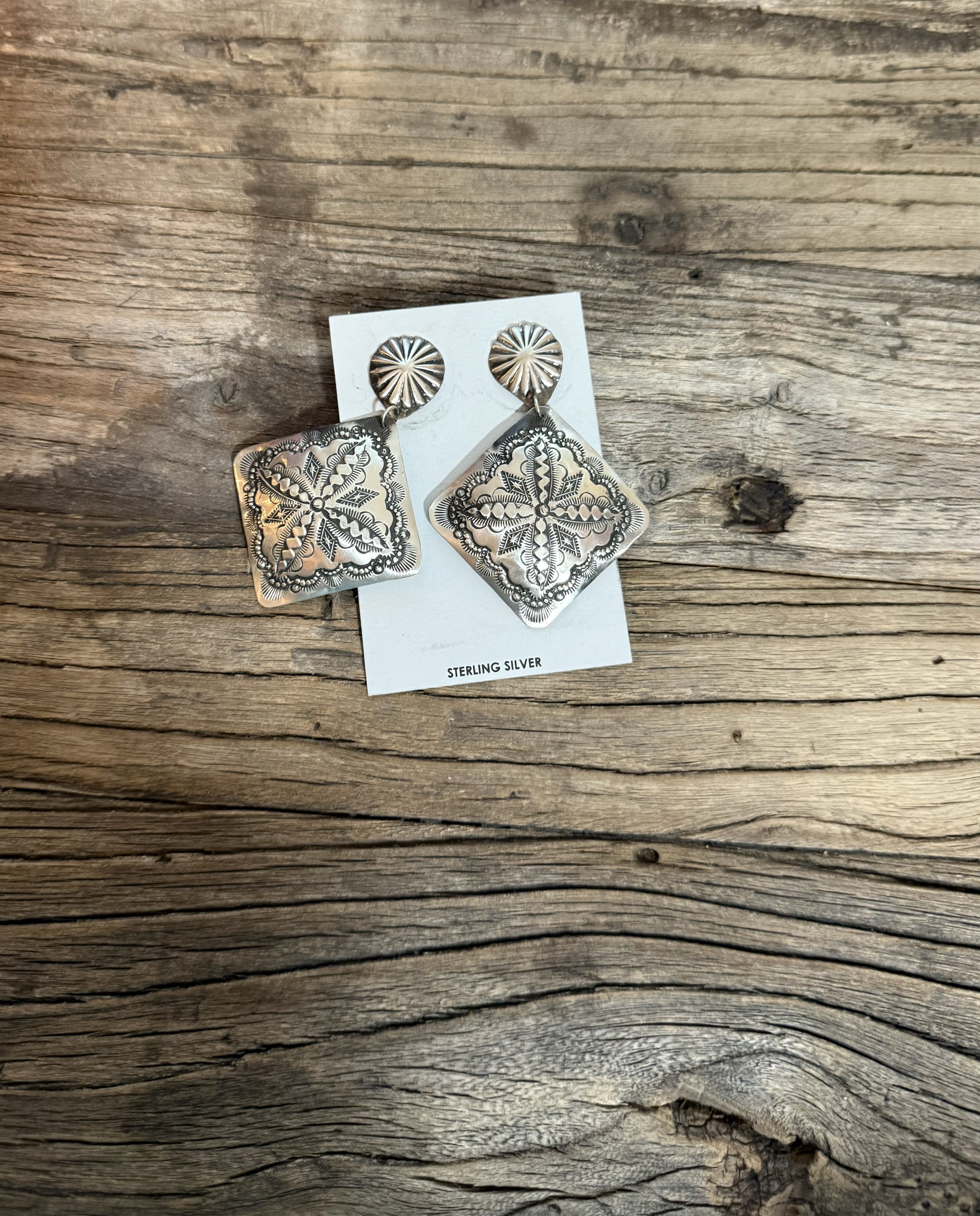 Image 1 of 3 Image 2 of 3 Image 3 of 3 Stamped Sterling Silver Diamond Earrings $199.00 Made with 100% sterling silver, these stamped metal earrings are bold and beautiful! Add To Cart Added! Made with 100% sterling silver, these stamped metal earrings are bold and beautiful!
